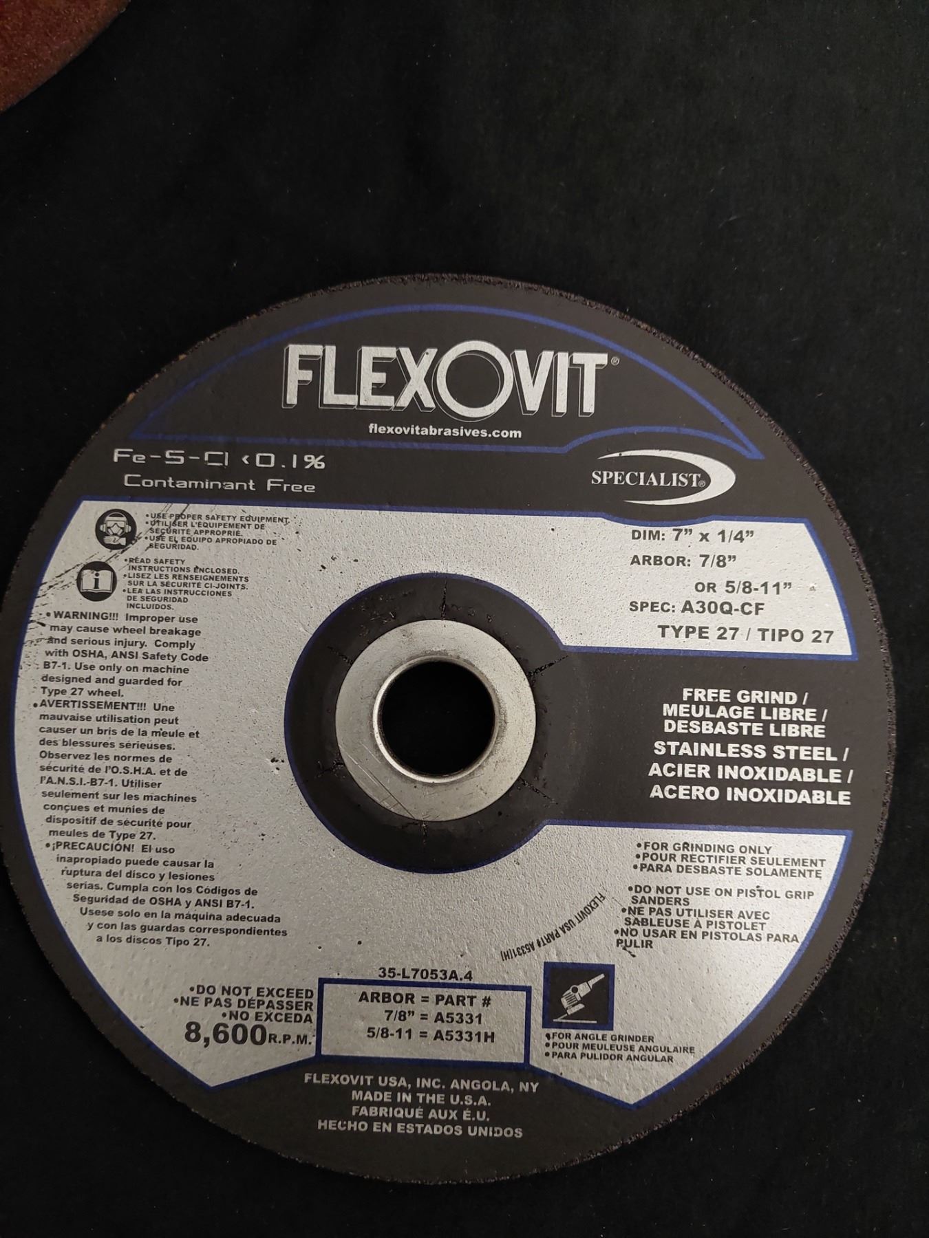 BOITE DE 10 DISQUES ABRASIFS FLEXOVIT TYPE 27, 7" X 1/4" X 7/8"