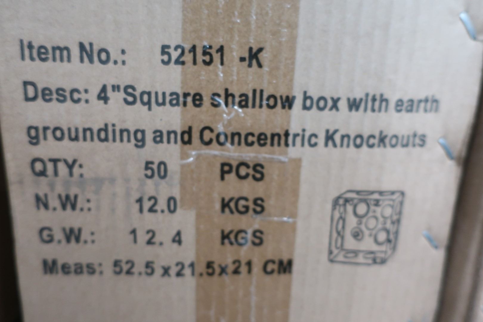 BOX OF 50pcs 4" SQUARE SHALLOW BOX WITH EARTH GROUNDING AND CONCENTRIC KNOCKOUT #52151-K