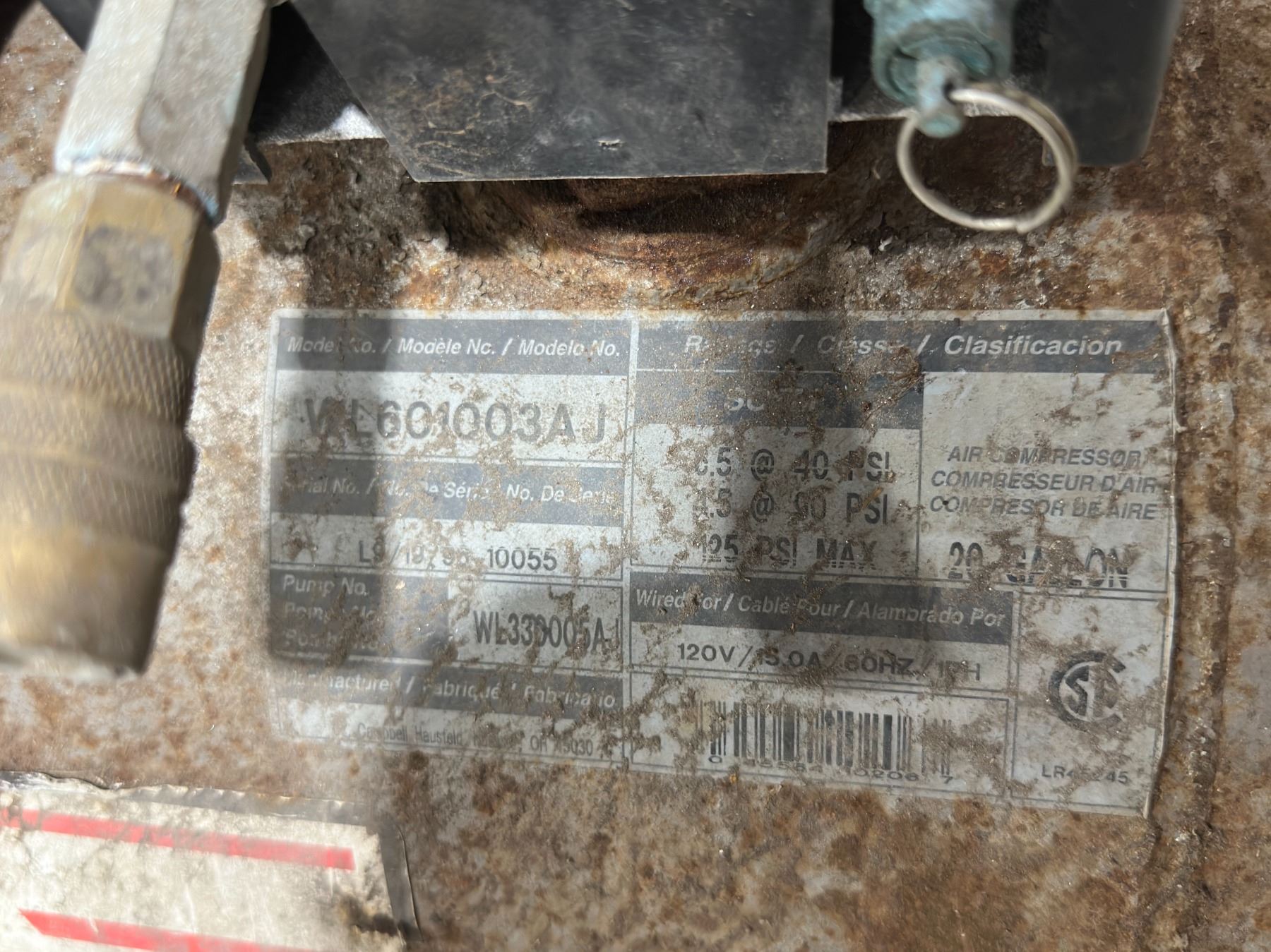 CAMPBELL HAUSFELD 20gal AIR COMPRESSOR 120v 60hz 125PSI MAX #WL601003AJ