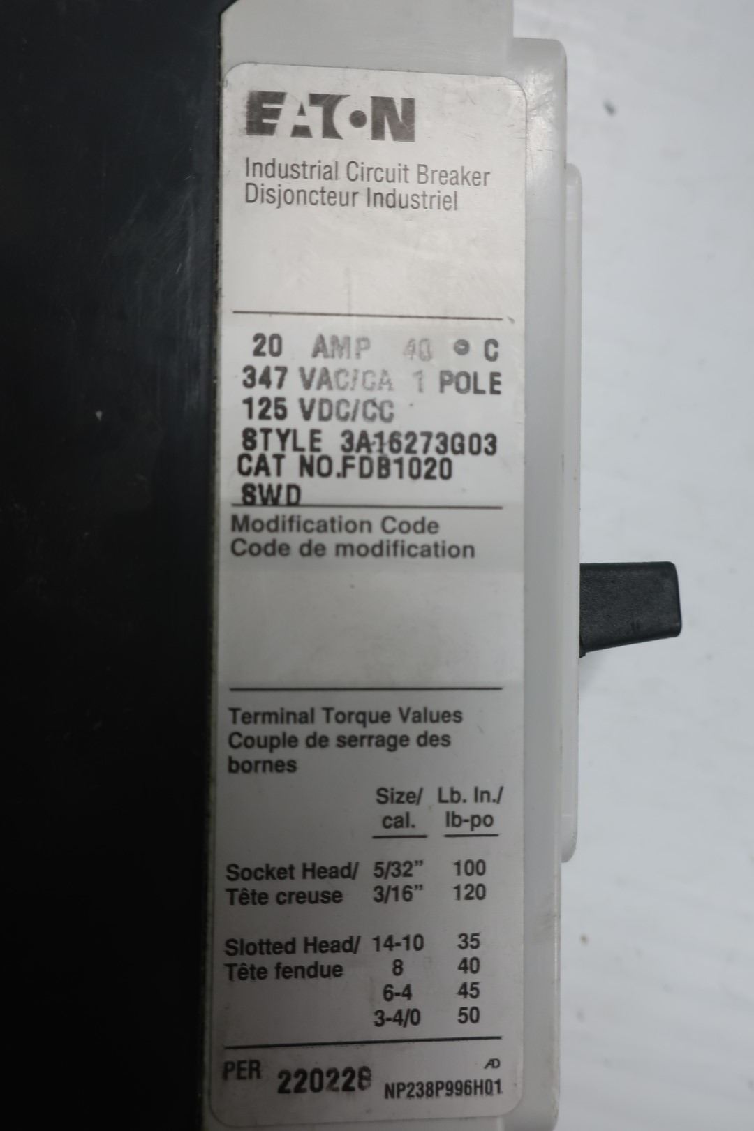 EATON FDB 20a CIRCUIT BREAKER, 1 POLE