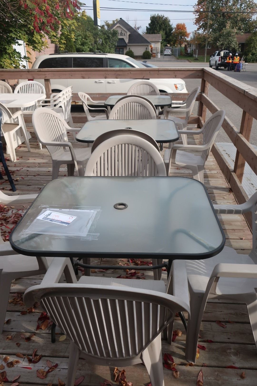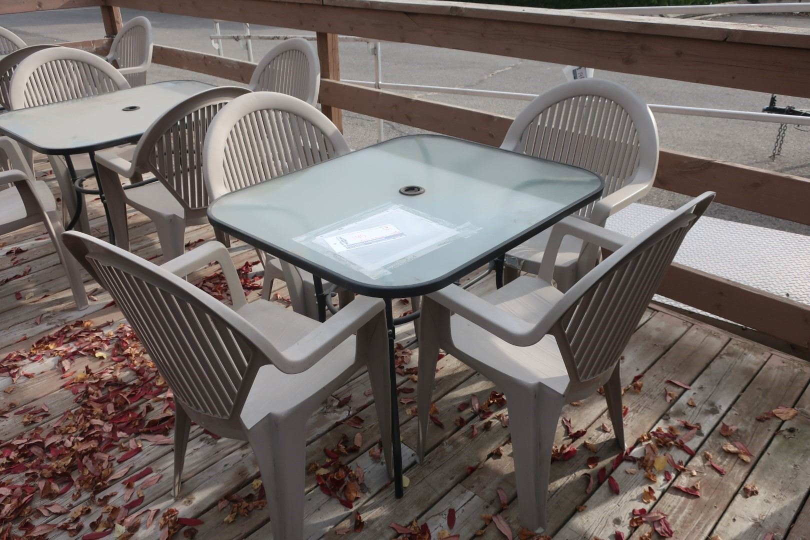 ENS: GLASS TABLE A/4-OUTDOOR PLASTIC CHAIRS