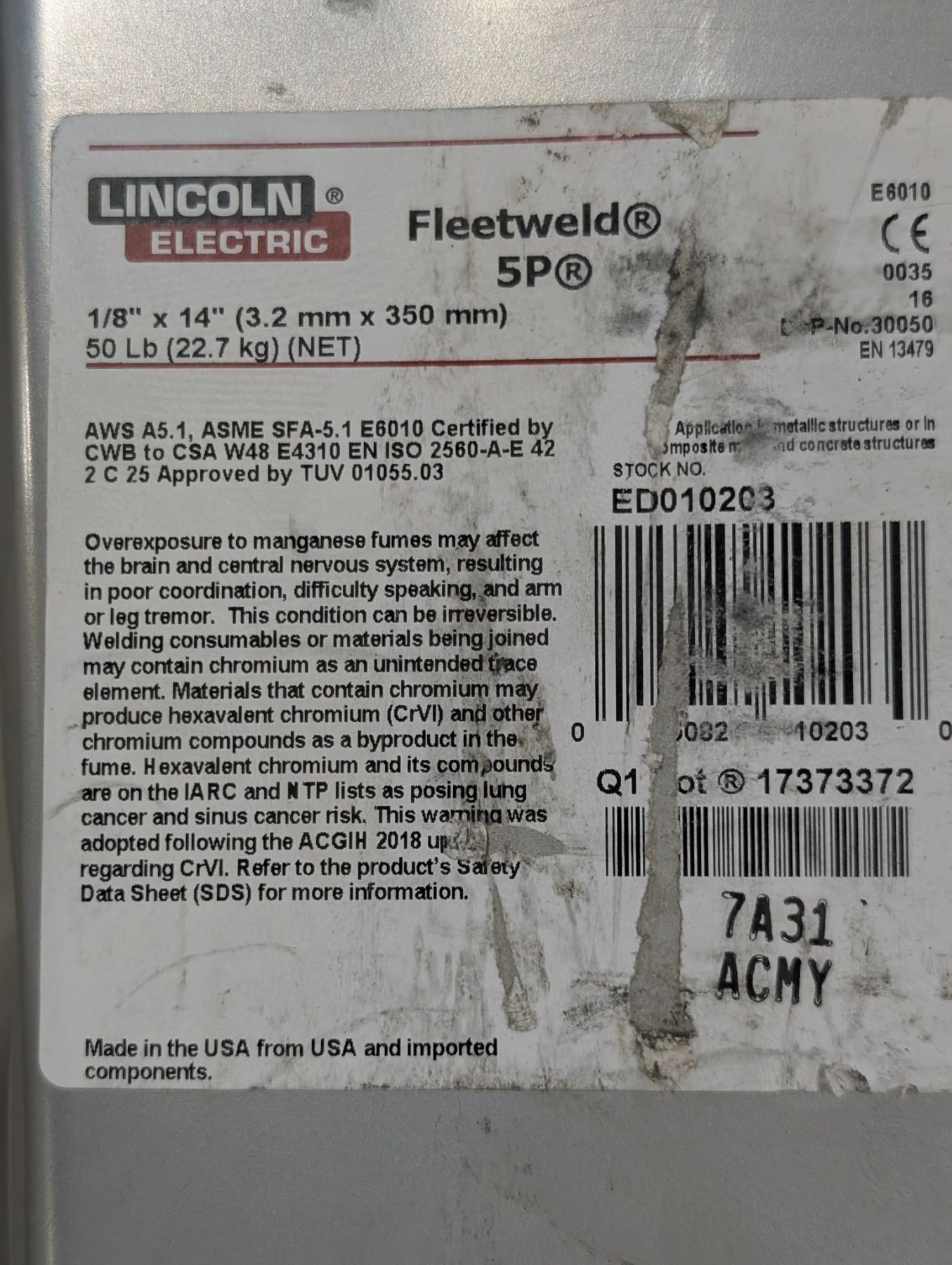 ÉLECTRODES FLEETWELD 5P 1/8"x14" 50LBS LINCOLN ELECTRONIC #E6010
