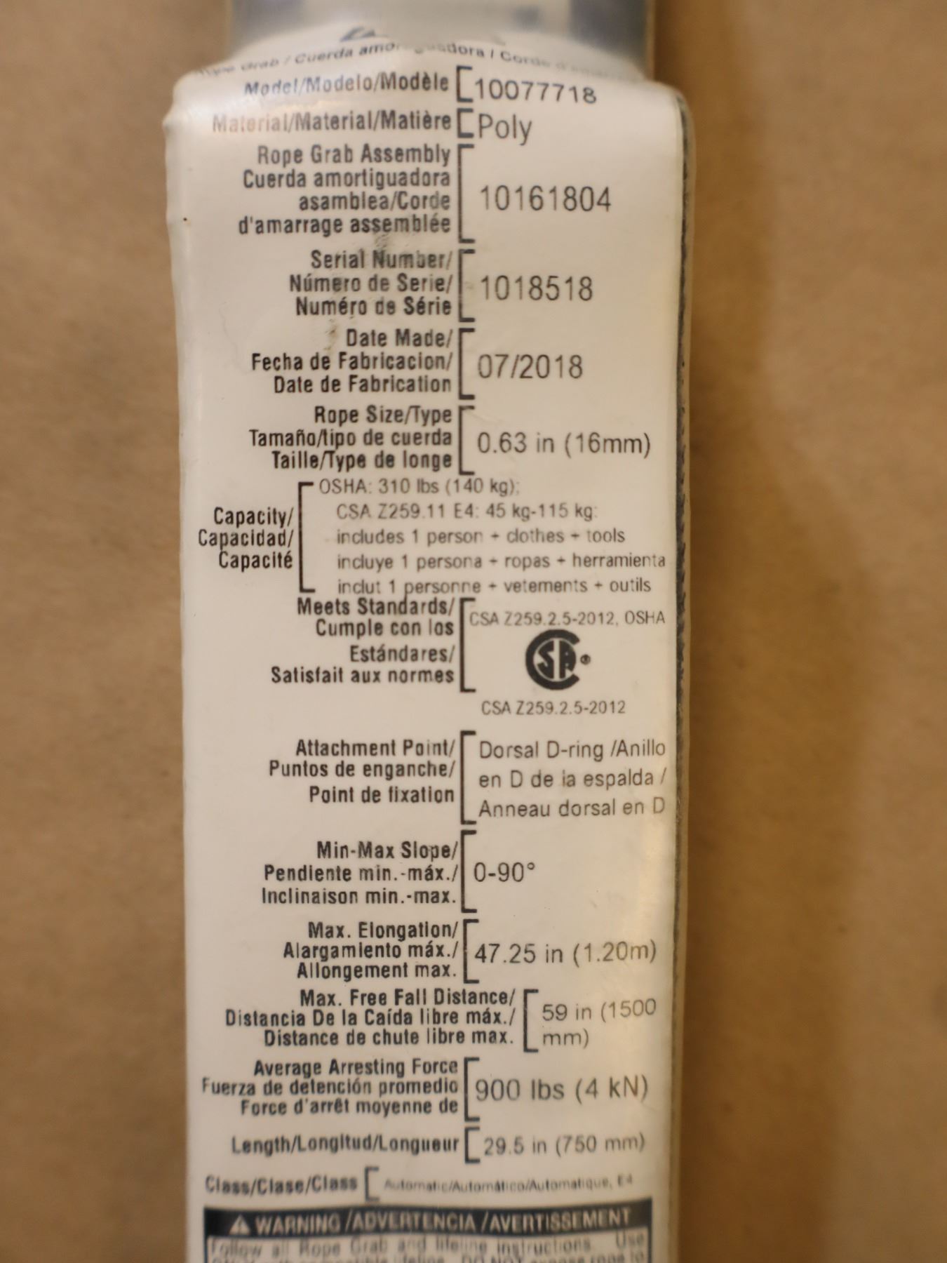 LIGNE DE SAUVETAGE 900LBS MSA #10077718