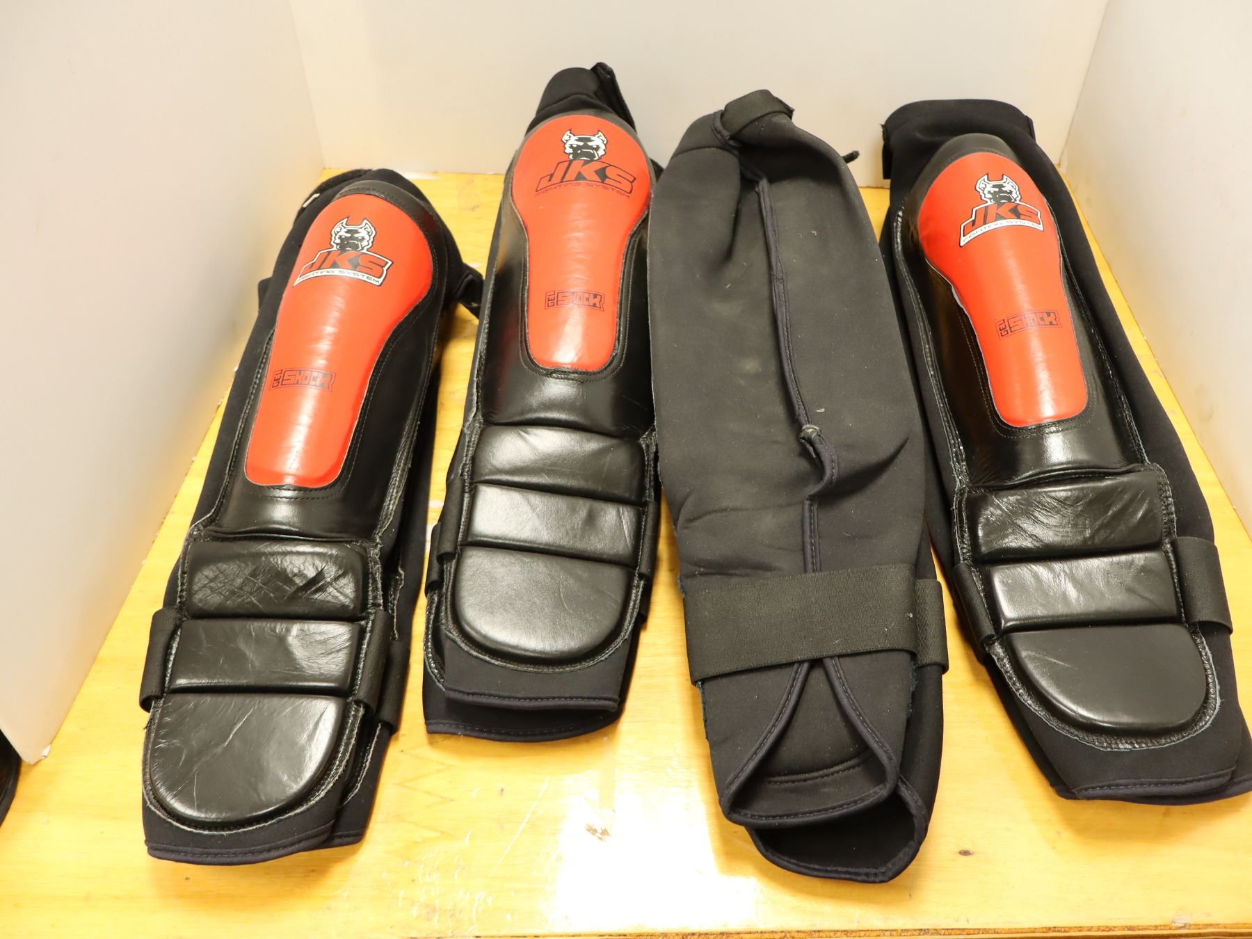 LOT: 4 PAIRES DE PROTÈGE-TIBIAS LOGO JKS NOIR/ROUGE GR: ASST