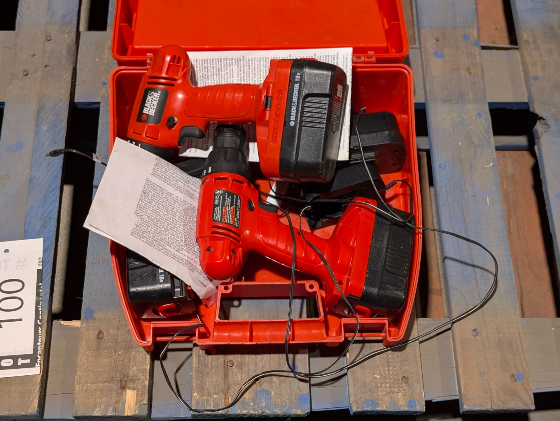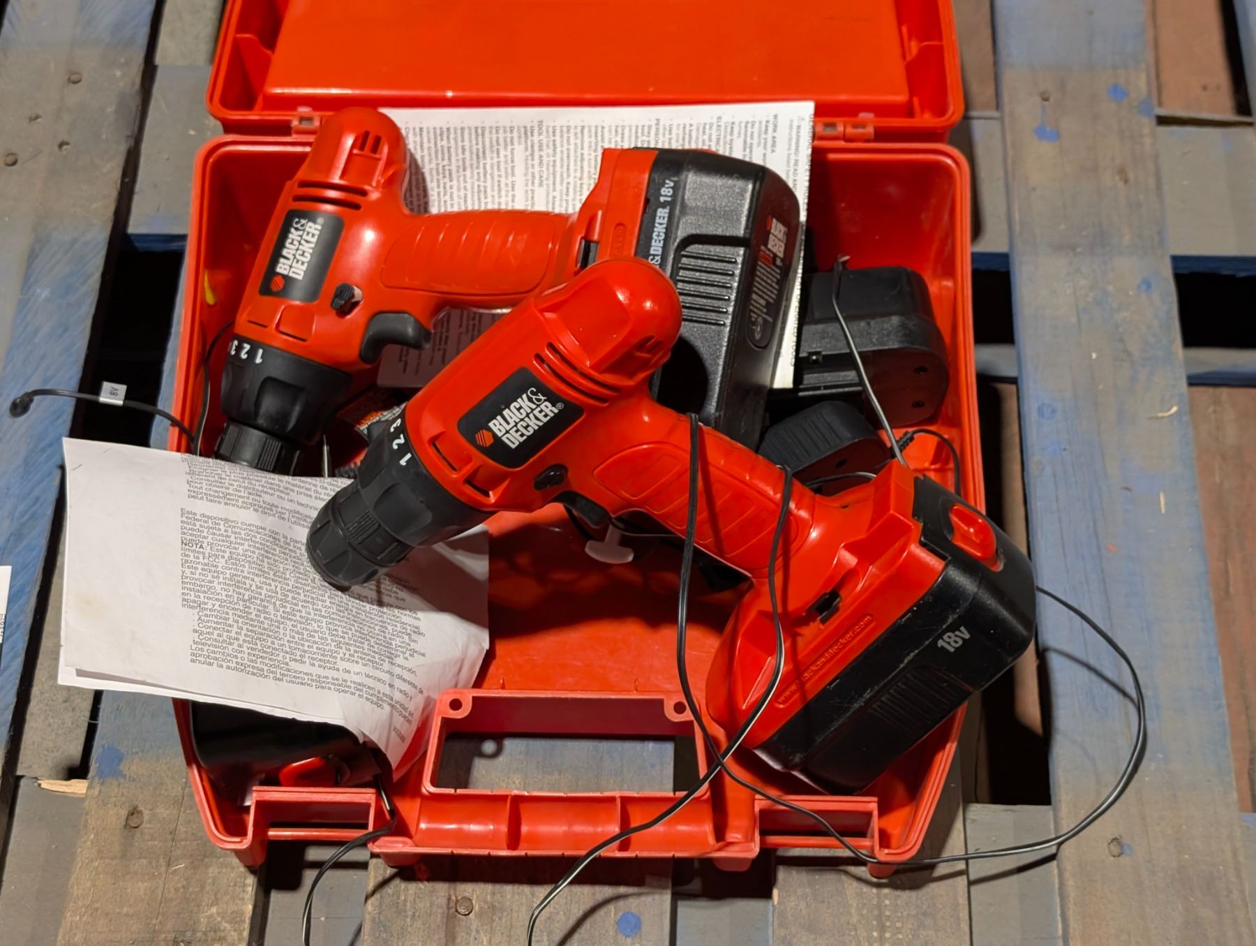 SET OF 2 B&D DRILLS, 2 TOOLS, 4 BATTERIES & 1 CHARGER