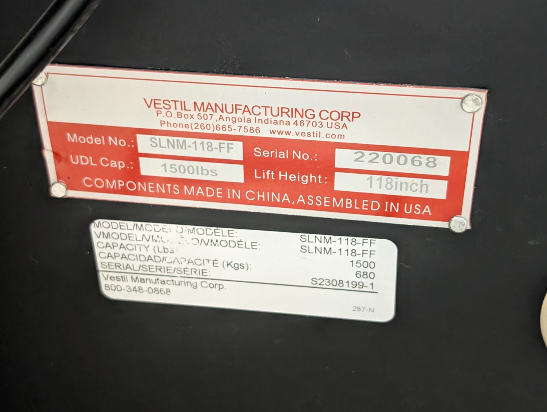 STACK POW LIFT VESTIL SLNM-18-FF, CAP. 1,500 LB, val: $9,500 $