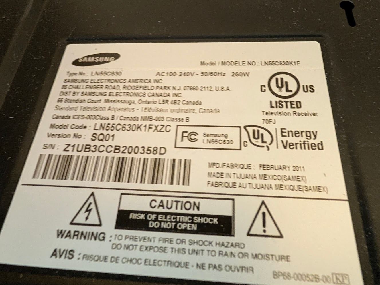 TÉLÉVISION 55" 1080 SAMSUNG LN55C630K1F AVEC SUPPORT MURALE *SANS TELECOMMANDE*