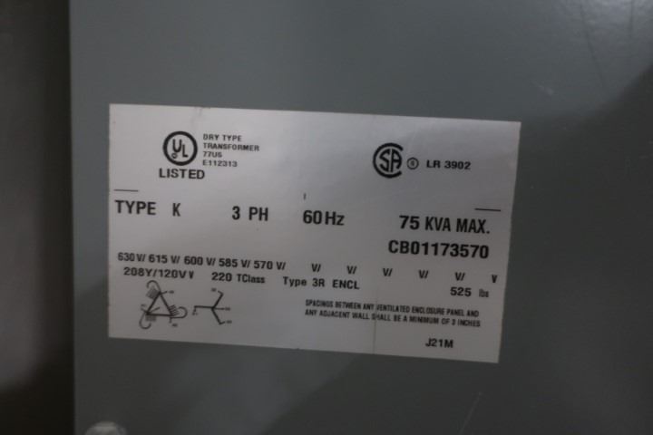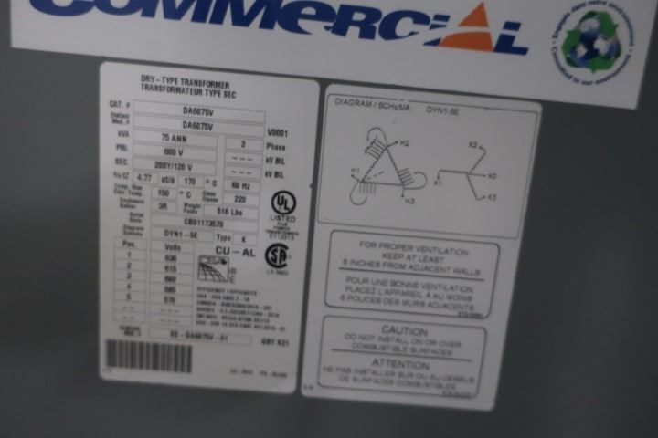 DRY TYPE TRANSFORMER DELTA DA6074V 75KVA 600v -208y/120v